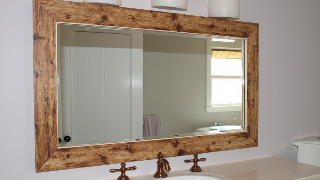 While exploring unique mirror styles, consider the rustic wooden mirror to bring warmth to your guest bathroom. This design, often crafted from reclaimed wood, adds a cozy, natural vibe. You’ll love how a 24×36-inch mirror with a 2-inch thick frame transforms the space instantly.