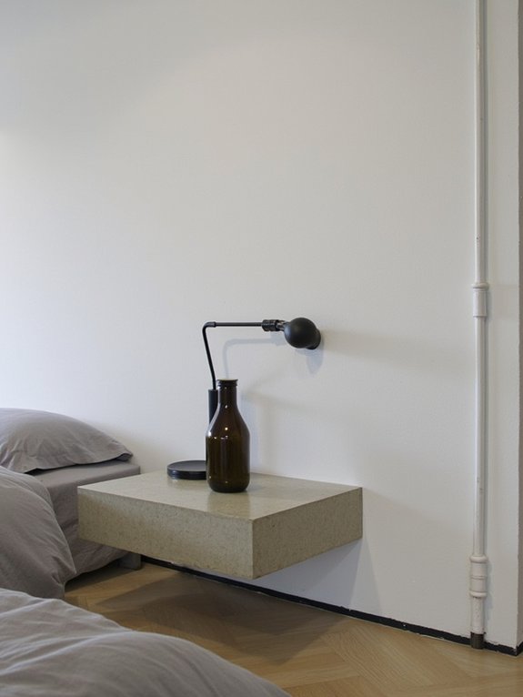 Floating concrete bedside tables combine modern minimalism with industrial style, creating the illusion of levitation against bedroom walls. These contemporary pieces feature hidden bracket systems that can support up to 40 pounds while maintaining their weightless appearance.