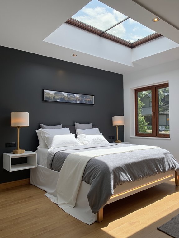 A skylight window installed above the bed serves as both a stunning focal point and practical lighting solution. The window bathes the bedroom in natural daylight while providing mesmerizing views of the sky above, transforming an ordinary sleeping space into a sophisticated retreat.