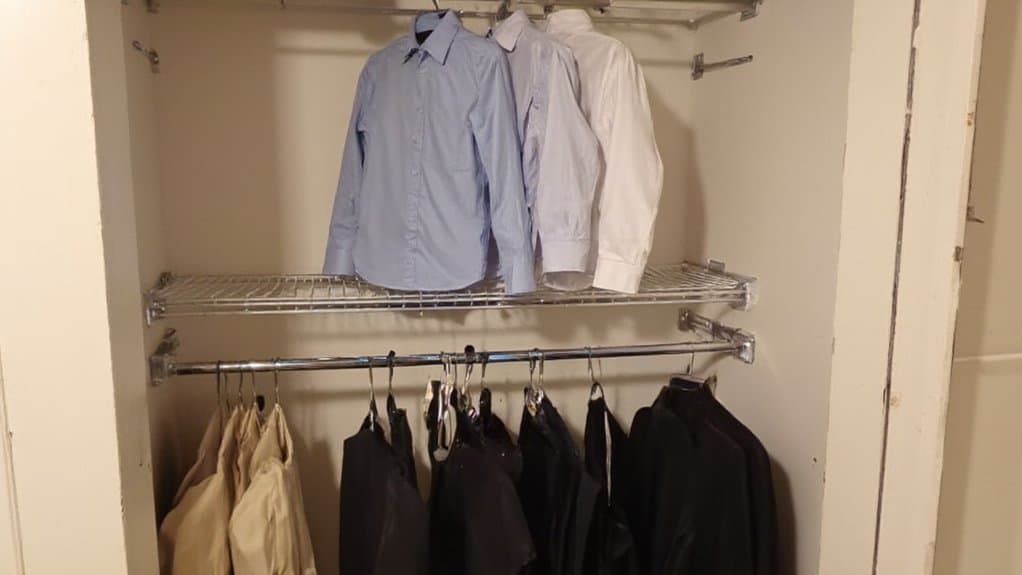 To organize with adjustable closet rods, start by evaluating the types of clothing you need to hang and group them by length to determine the best rod height for each section. If your closet allows, consider installing multiple rods at varying heights to create a double-hang system for shorter items like shirts and pants, effectively doubling your hanging space. Make certain the rods are securely mounted according to the manufacturer’s instructions to support the weight of your clothing without sagging or bending over time.
