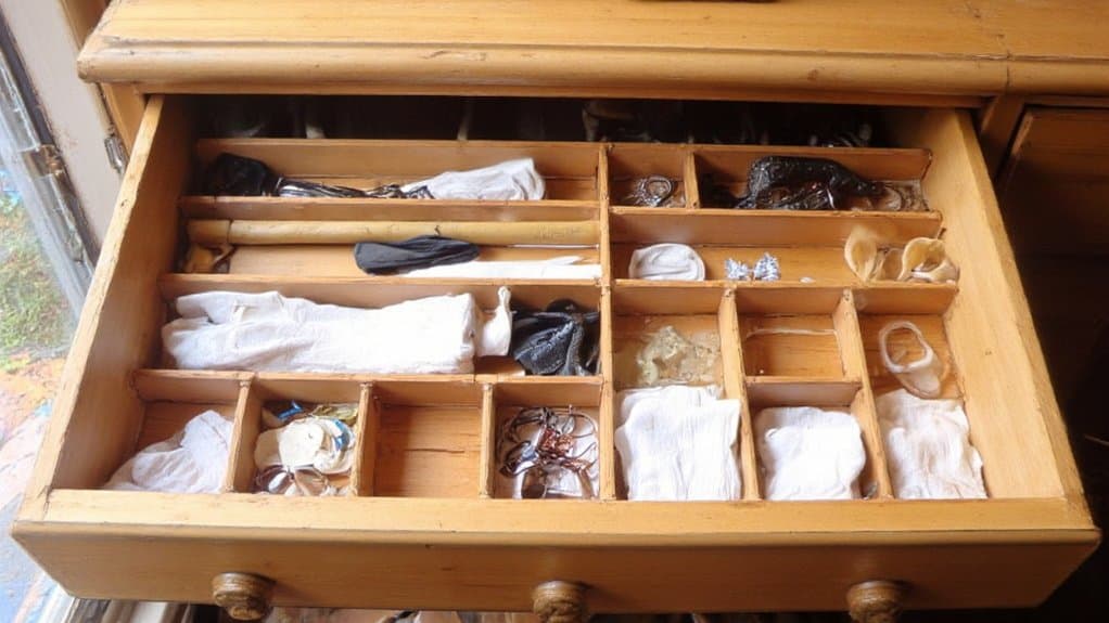 Custom drawer organizers are a fantastic way to maximize space and maintain order in your closet drawers. Start by measuring the dimensions of each drawer to guarantee a perfect fit for your organizers, considering the depth, width, and length. You can purchase adjustable organizers or create DIY solutions using materials like foam board or wood to craft compartments tailored to your specific needs, such as for jewelry, socks, or accessories.