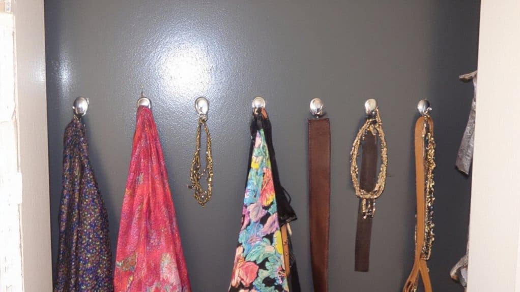 Begin by grouping similar items together, such as all belts on one hook and scarves on another, to create a streamlined look. Place the magnetic hooks at varying heights to maximize space and guarantee visibility of your items. Regularly declutter the hooks by removing items you no longer use, keeping the setup functional and tidy.