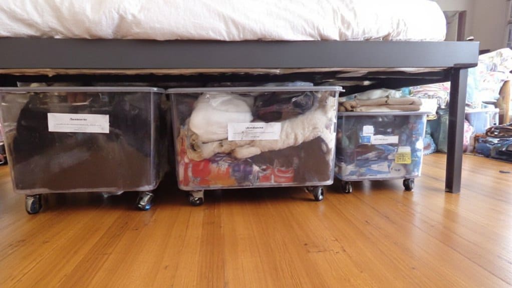 Under-bed storage bins are a fantastic solution for maximizing space in a bedroom, especially when closet space is limited. These bins can store seasonal clothing, extra bedding, or even shoes, keeping them out of sight yet easily accessible. Before purchasing, measure the height and width under your bed to guarantee the bins fit properly and consider options with wheels for effortless retrieval.