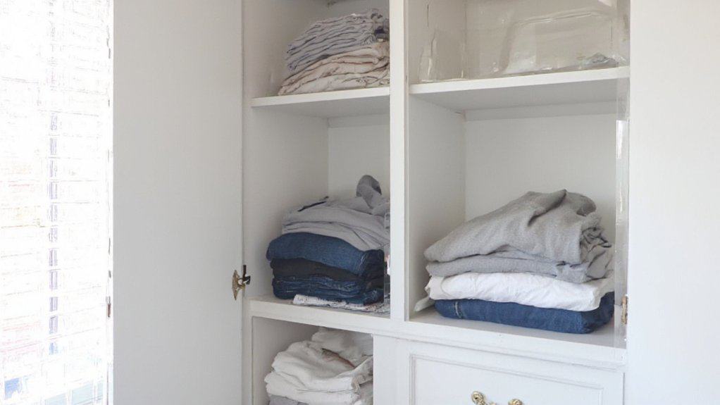 To maximize the use of folded shelf dividers, fold your clothing uniformly to maintain a consistent height within each section. Sort items by type or color for easy identification, and label the dividers if needed to maintain order over time. This method not only saves space but also makes it simple to grab what you need without disrupting the entire shelf.