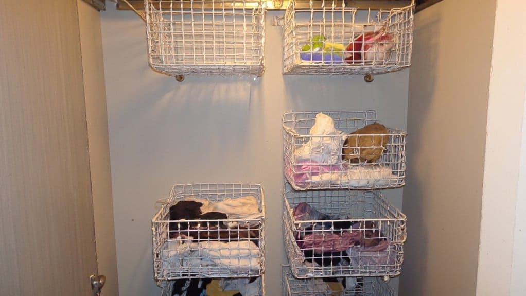 Begin by categorizing your belongings and assigning each category to a specific basket—socks in one, scarves in another, for instance—to create a clear system. Label each basket if needed to maintain order and guarantee quick identification. Regularly declutter by removing items you no longer use, and adjust the basket contents seasonally to keep the system functional and uncluttered.