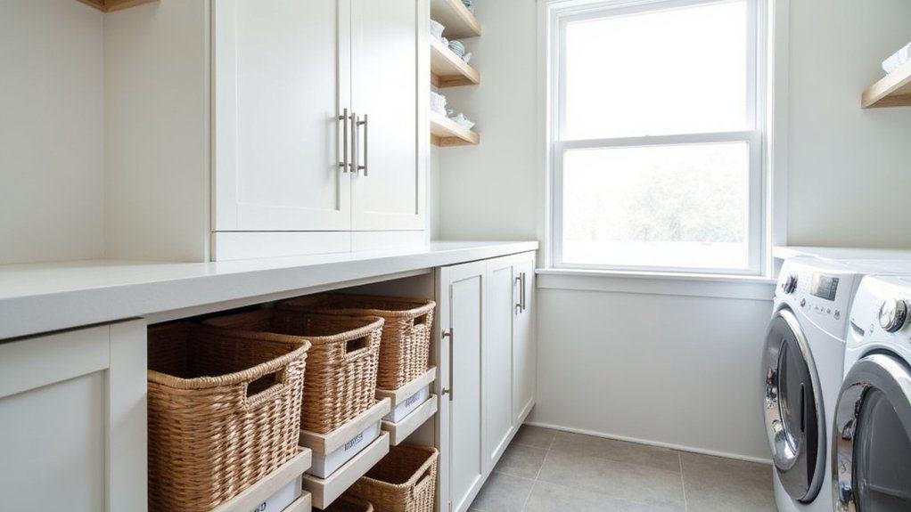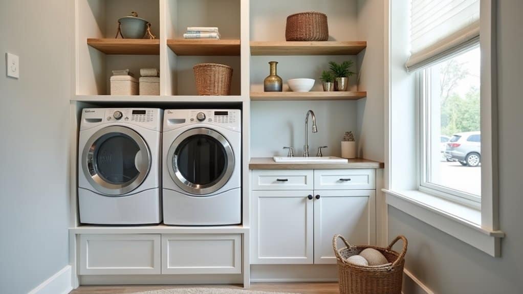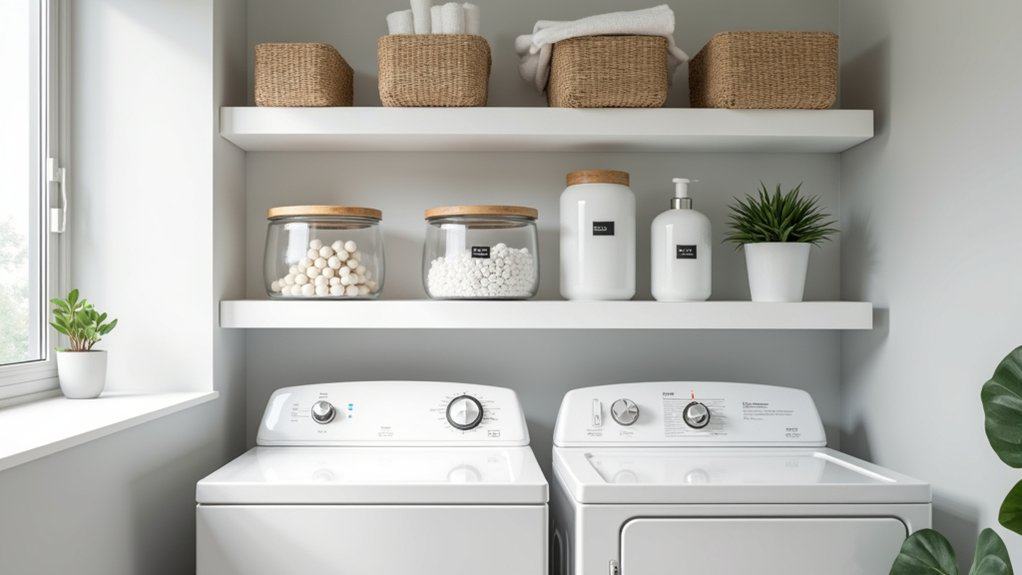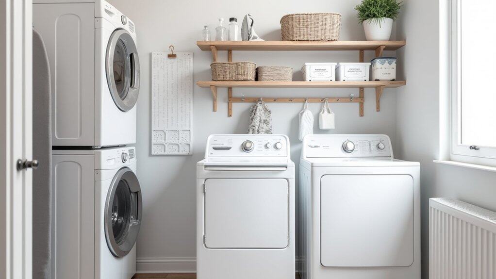 Hey, let’s transform your laundry room into a sleek, functional haven! I’ve tackled my own cramped space—think 5×7 feet of chaos—and found vertical storage to be a game-changer. Imagine floating shelves above your washer, holding detergents within arm’s reach. It’s a snap to install, too! But there’s more to this setup. Stick with me to uncover hidden storage tricks that’ll blow your mind.