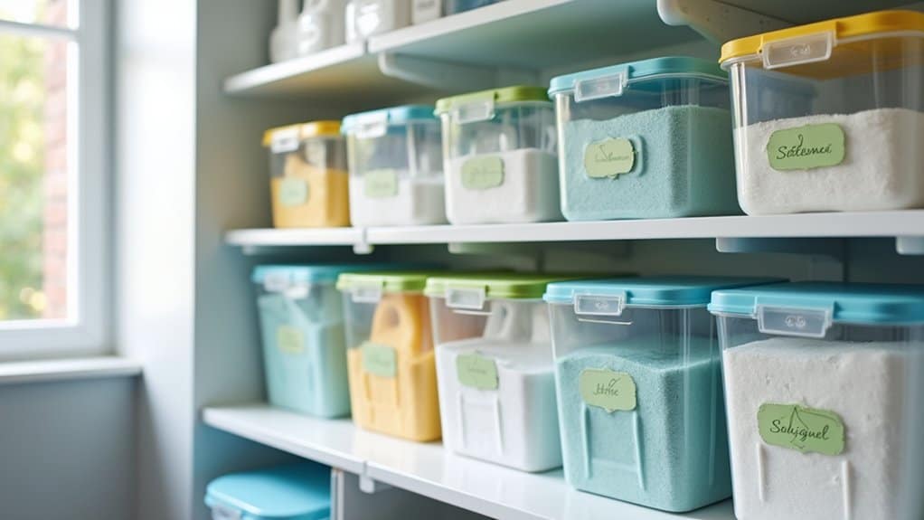 To implement this system effectively, consider investing in uniform containers or jars with colored lids or tags to maintain a cohesive look. Place these containers on accessible shelves or in cabinets, ensuring that frequently used items are within reach while less-used products are stored higher up or in the back. This method not only streamlines your laundry routine but also adds a pop of color to an often utilitarian space, making the chore feel a bit more enjoyable.
