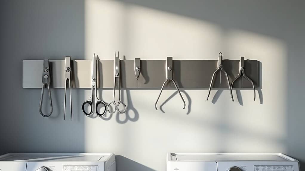 A magnetic tool strip is a versatile and space-saving solution for organizing small metal items in your laundry room, such as scissors, clothespins, or small tools. Mounting a magnetic strip on the wall or inside a cabinet door keeps these items easily accessible while freeing up drawer or counter space. Choose a strip with a strong magnetic hold and guarantee it’s installed at a convenient height for quick access.