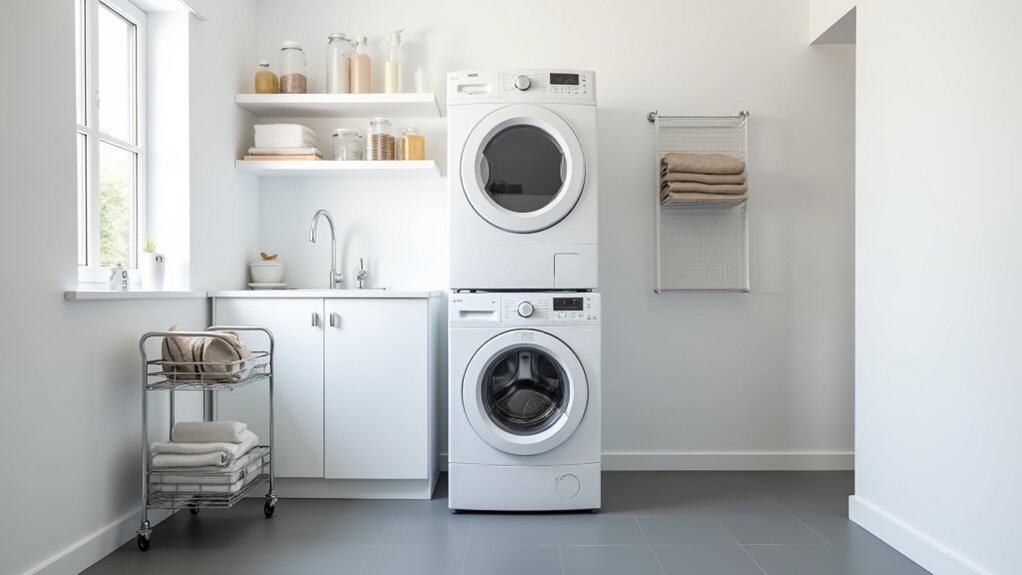 Additionally, consider adding a fold-out drying rack or a retractable clothesline nearby for items that can’t go in the dryer, keeping them off the floor and out of the way. Utilize the space beneath or beside the units for a narrow rolling cart to hold smaller items like dryer sheets or cleaning supplies. This setup not only keeps the area tidy but also confirms that everything you need is easily accessible during laundry tasks.