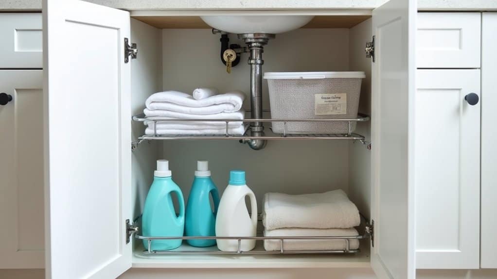 Installing an under-sink organizer in your laundry room is a practical way to maximize space and keep cleaning supplies or detergent bottles neatly stored. Start by measuring the dimensions of the cabinet under your sink to guarantee the organizer you choose fits properly, accounting for plumbing or any obstructions. Clear out the existing items, clean the area, and install the organizer according to the manufacturer’s instructions, whether it’s a sliding drawer, tiered shelf, or stackable bins.