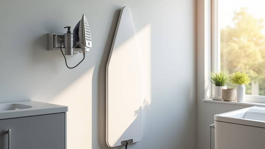 Integrating a foldable ironing board into your laundry room can greatly enhance both functionality and space efficiency. Choose a wall-mounted or over-the-door foldable ironing board that can be tucked away when not in use, keeping the area clutter-free. Confirm the mounting location is easily accessible, near an electrical outlet for the iron, and at a comfortable height to avoid strain during use.