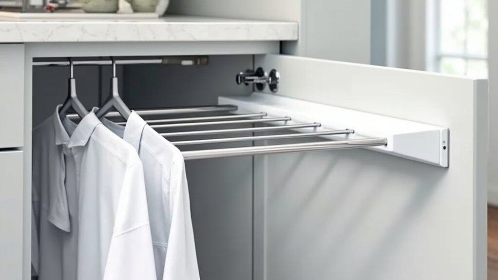 A pull-out drying rack is a fantastic space-saving solution for any laundry room, especially in smaller homes or apartments where air-drying clothes can be a challenge. Installing a pull-out rack near a wall or within a cabinet allows you to utilize vertical or hidden space effectively, keeping your laundry area clutter-free. Confirm the rack is sturdy and can handle the weight of wet clothes by choosing high-quality materials and securing it properly during installation.