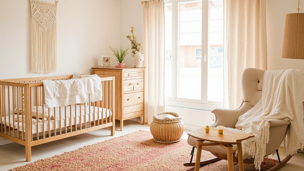 As you shift gears from sleek Scandinavian furniture, immerse yourself in the warmth of Bohemian textile accents for your nursery. These vibrant, layered fabrics bring cozy charm with earthy tones and intricate patterns. You’ll create a nurturing space by adding specific touches.
