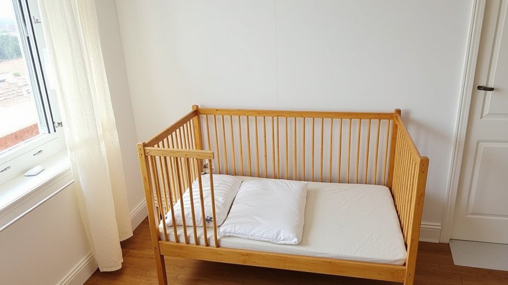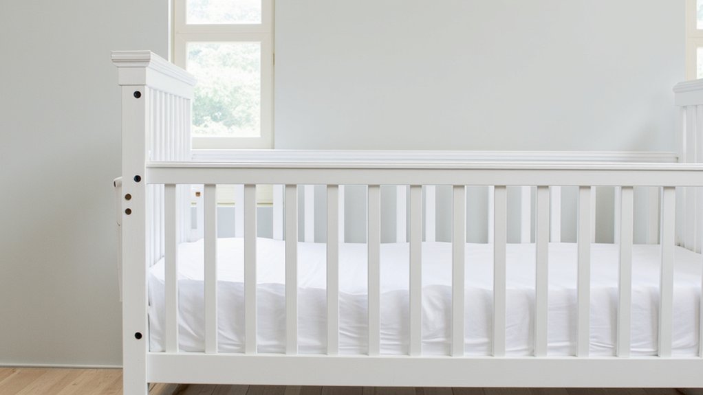 How can you create a serene nursery with a minimalist crib design? You’ve got to focus on simplicity and function while guaranteeing safety. Start by picking a crib with clean lines, like one measuring 52 inches long and 28 inches wide, fitting standard mattresses. Install it within the first week of decorating for planning.