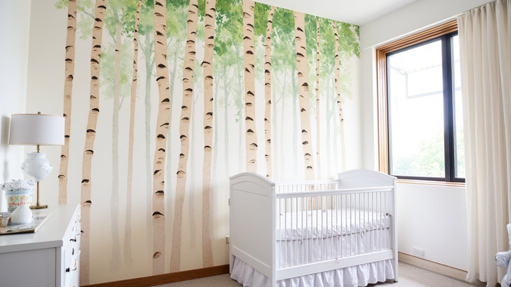Let’s shift focus from organizing storage to bringing life to your nursery walls with nature-inspired murals. You’re creating a calming space, so pick a wall—ideally 8×10 feet—for a forest or meadow scene. Experts suggest, “Choose soft greens and earthy tones for a timeless look,” says designer Mia Carter.