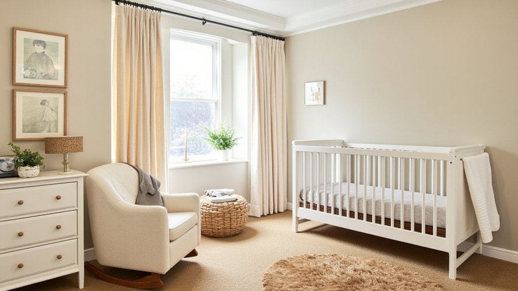 While crafting a serene nursery, consider using a neutral color palette to complement your minimalist crib design. Neutrals like soft beige, warm taupe, or gentle gray create a calm vibe. Paint walls in a matte finish, covering 120 square feet with one gallon, ideally over two days.