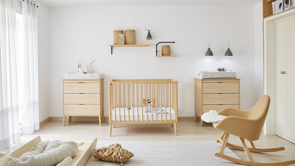 While soft rugs set a cozy foundation, Scandinavian-inspired furniture brings clean lines and functionality to your nursery. You’ll love how these pieces blend simplicity with purpose, creating a calm space for your baby. Opt for a crib with a 50-inch length and natural wood finish for timeless appeal.