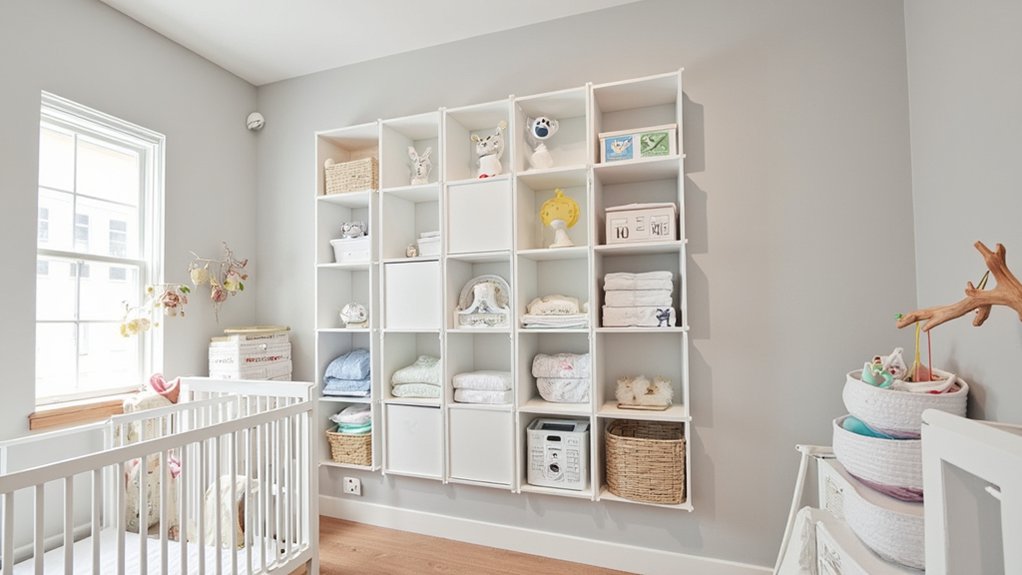 Before you fill your nursery with toys and clothes, think about smart storage to keep clutter at bay. Modular storage solutions adapt as your child grows, saving space and stress. Start planning within the first month of designing, ensuring a tidy 10×10-foot nursery with ease.