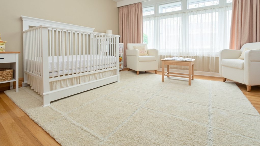Three essential elements can transform your nursery floor, and soft textured rugs top the list for comfort and style. You’ll love how they cushion tiny feet and add warmth. Opt for a rug about 5×7 feet to cover key play areas, guaranteeing it’s machine-washable for easy cleaning every two weeks.