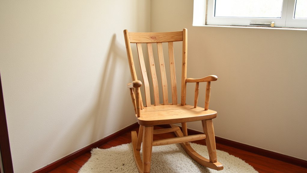 Moving on from the cozy flair of Bohemian textiles, let’s focus on adding a classic wooden rocking chair to your nursery. You’re creating a timeless space, and a rocking chair, about 40 inches tall with a 20-inch seat width, offers comfort during late-night feedings around 2 a.m. Choose one with these features for lasting style: