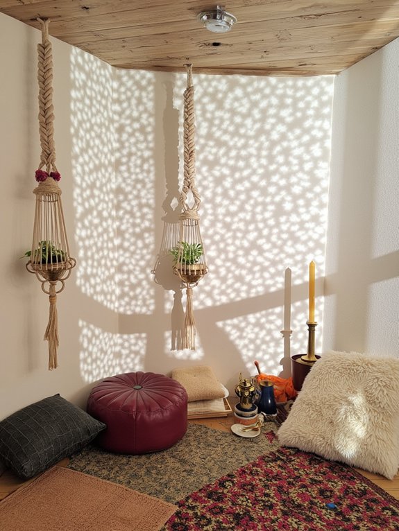 Transform a corner into an intimate meditation sanctuary by layering authentic Berber rugs and cushions within a 6×6 foot space. A low wooden table stands 18 inches high, perfect for holding tea or crystals, while traditional metalwork lanterns provide warm, dimmable illumination.