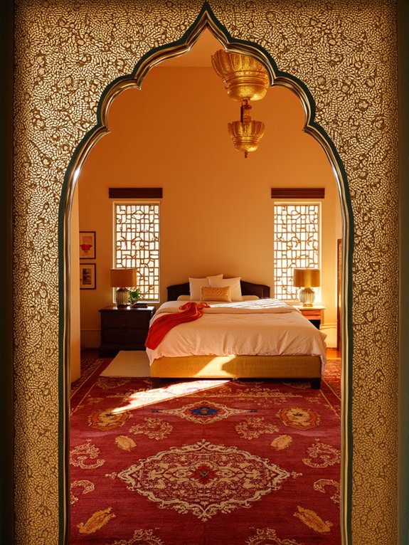 This dramatic gold hammered metal doorway creates a grand entrance for Moroccan-inspired bedrooms, blending traditional craftsmanship with modern luxury. The design showcases intricate geometric patterns typical of Moroccan architecture, making a bold statement while the hand-hammered details shimmer in changing light.