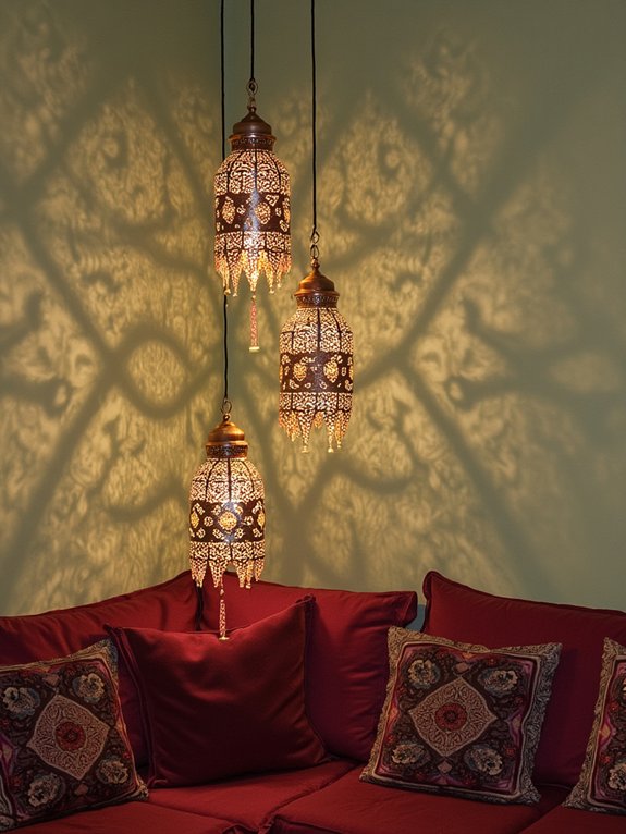 Metal lanterns with intricate cutout patterns create an enchanting lighting display in the bedroom’s reading nook. When illuminated, these traditional pieces cast mesmerizing shadows across walls and ceilings, transforming the space through their interplay of light and geometric designs.
