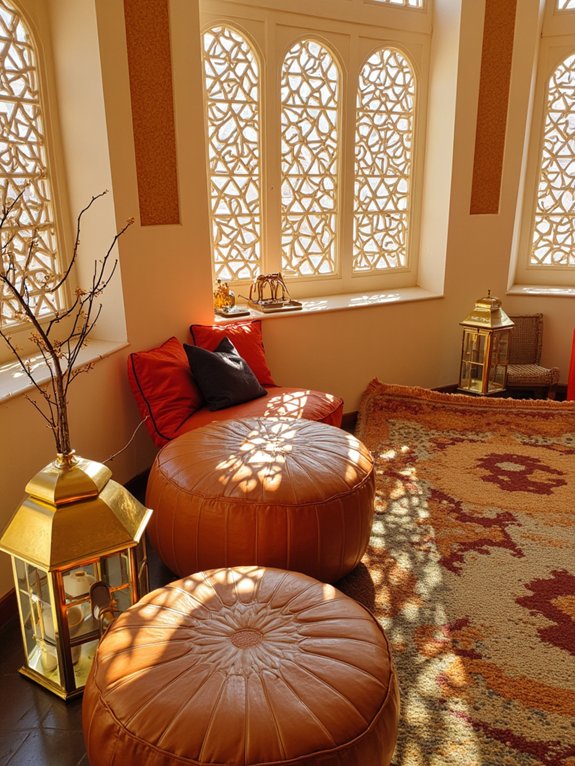 The poufs are positioned 24-30 inches apart, allowing easy movement while maintaining intimate conversation distances. This flexible seating arrangement brings warmth and authenticity to the Moroccan-inspired bedroom retreat while providing both style and function.