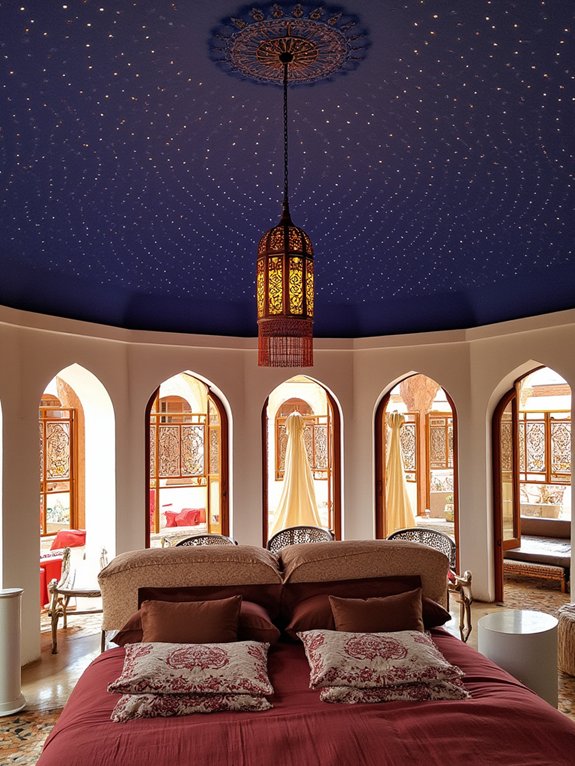 A desert night sky ceiling creates an enchanting Moroccan-inspired sanctuary by transforming an ordinary bedroom ceiling into a starlit canopy. Drawing from traditional North African architecture, the design incorporates fiber optic lighting and metallic accents to simulate twinkling constellations against a deep blue backdrop.