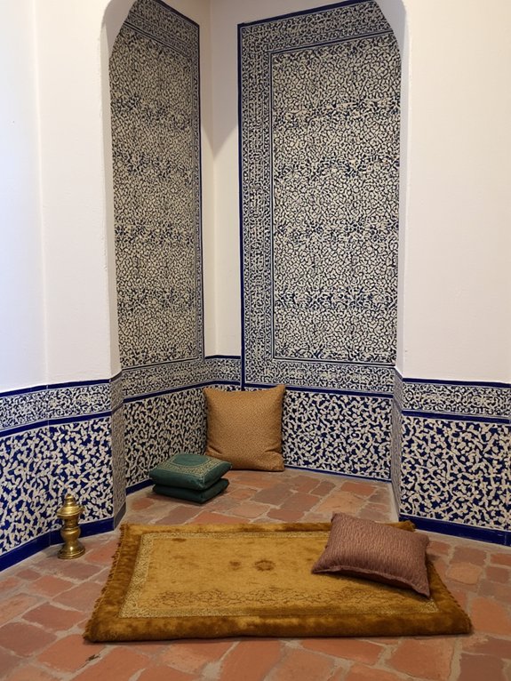 A dedicated 8×8 foot prayer space showcases intricate zellige tile patterns on its walls, blending sacred geometry with traditional Moroccan craftsmanship. The handcrafted tiles create a serene atmosphere perfect for daily prayers and meditation, with a plush prayer rug centered on bamboo flooring.