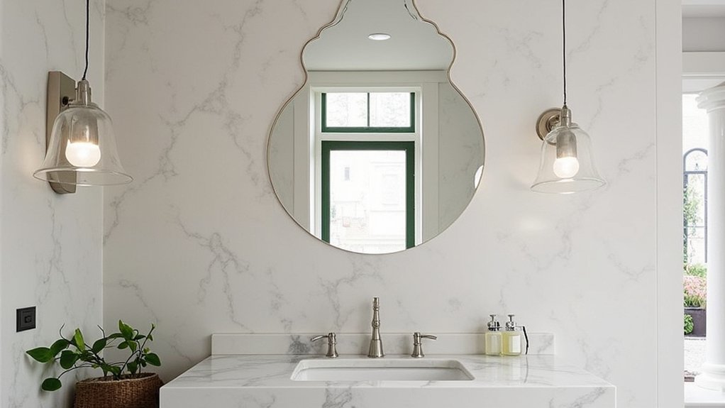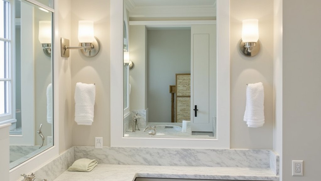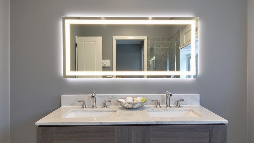 While upgrading your bathroom’s ambiance, consider a backlit mirror design for a sleek, modern touch. It’s an easy way to add soft, even lighting around your mirror, typically 24 to 36 inches wide, enhancing visibility for daily routines like shaving or makeup application.