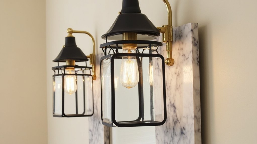 While updating your bathroom’s vibe, consider installing chic lantern-style lights for a timeless, elegant touch. These fixtures blend vintage charm with modern flair, perfect for a cozy yet classy space. Hang them near your vanity or as wall sconces, ensuring they’re 60-66 inches above the floor for ideal lighting.