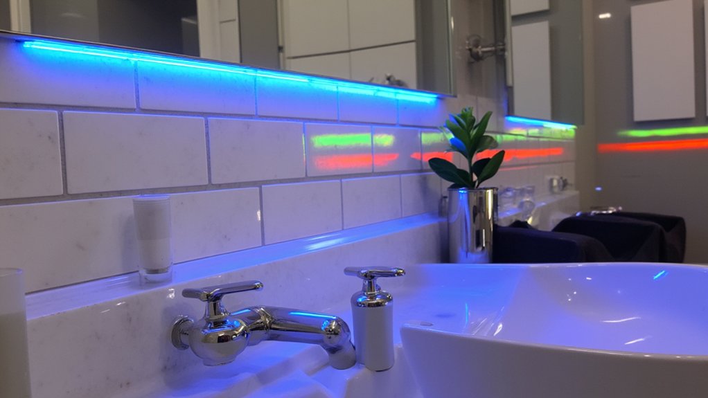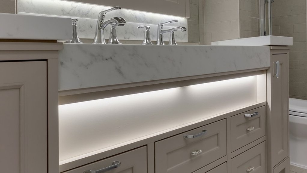 Looking to enhance your bathroom’s glow beyond the mirror area? Under-cabinet LED strips are your perfect solution. These slim lights, often just 0.5 inches wide, tuck neatly beneath cabinets, casting a soft, warm glow over countertops. Install them in about 30 minutes with adhesive backing for a hassle-free setup.