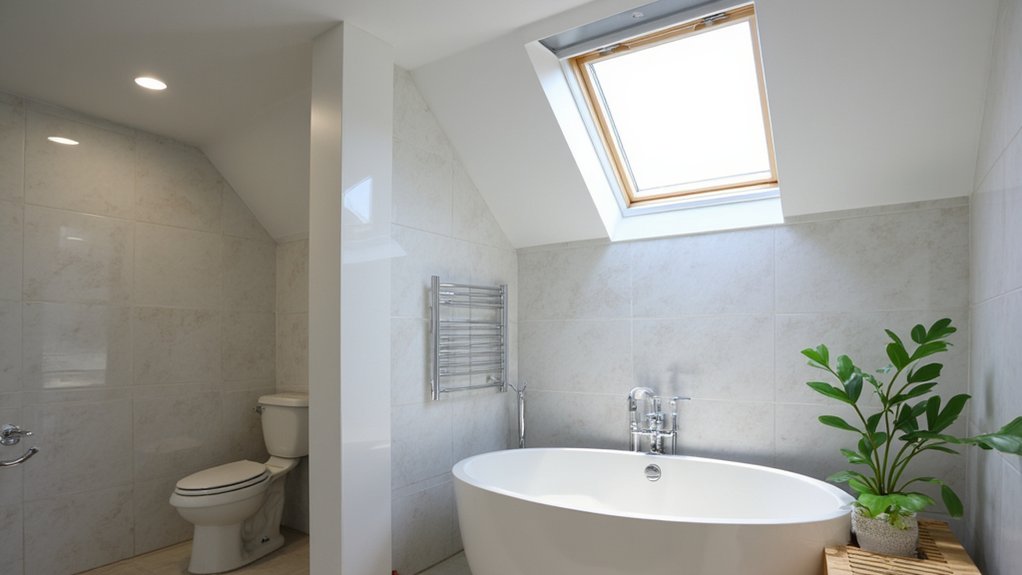 How can you brighten your bathroom without relying on electric lights all day? Consider installing a skylight for natural illumination. It’s a game-changer, flooding your space with sunlight from dawn till dusk, roughly 12 hours daily. Position it above your vanity or shower for a 2×3-foot opening to maximize light spread.