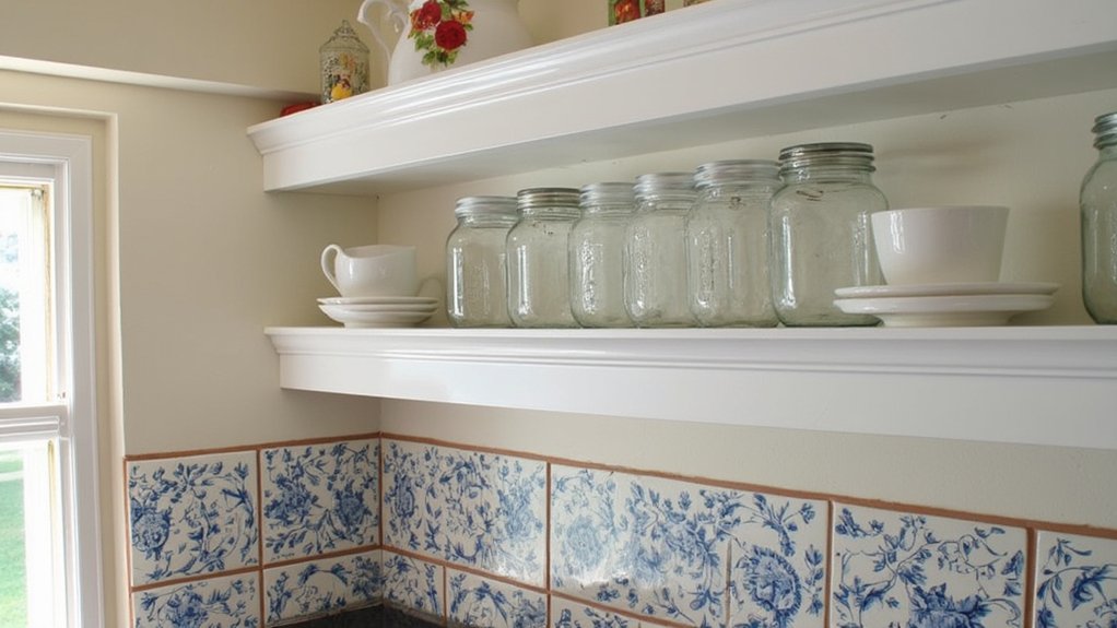 Moving from the bold look of industrial metal shelves, you’ve got a charming option with vintage ceramic tile shelves for your kitchen. These beauties add a retro vibe with practical flair. They’re perfect for displaying dishes or jars, blending style with function.