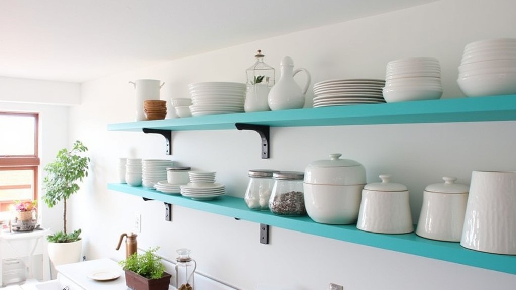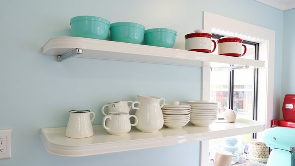 Take a step back in time with retro enamel shelves that bring a vintage flair to your kitchen. You’ll love their glossy finish and durability, perfect for displaying colorful dishes. Install them at 18 inches above your counter for easy access, and secure with heavy-duty brackets for a 50-pound load.