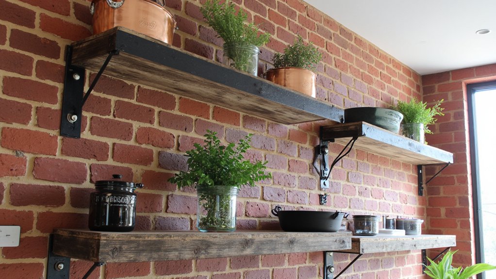 While glass shelves bring elegance, industrial metal shelves offer a rugged, trendy vibe for your kitchen upgrade. You can transform your space with these sturdy options, often made of steel or iron, sized around 36 inches wide and 12 inches deep. Install them in under two hours for instant impact.