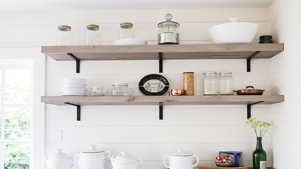 If you’re craving a cozy, farmhouse feel in your kitchen, rustic barnwood shelves offer the perfect solution. They bring warmth and character with their weathered, natural look. You can install these shelves yourself in about 2-3 hours using reclaimed wood, cut to 36-inch lengths for standard cabinets.