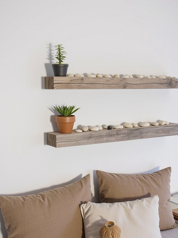 Create a striking wall accent by mounting weathered driftwood pieces horizontally with concealed brackets, giving them a floating appearance. The natural, wave-worn wood pieces, ideally 24-36 inches long, serve as rustic display shelves while maintaining their organic character.