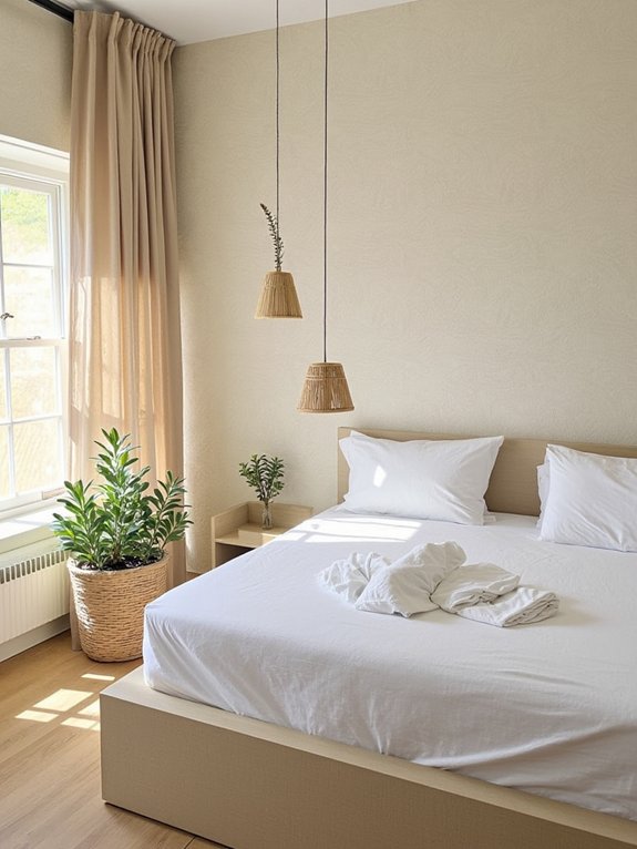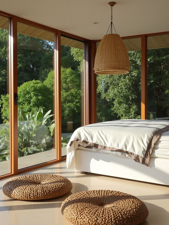 From sustainable bamboo furnishings to handwoven textiles and botanical accents, each element works together to create a sophisticated yet grounded environment that promotes rest and renewal while maintaining clean, modern sensibilities.