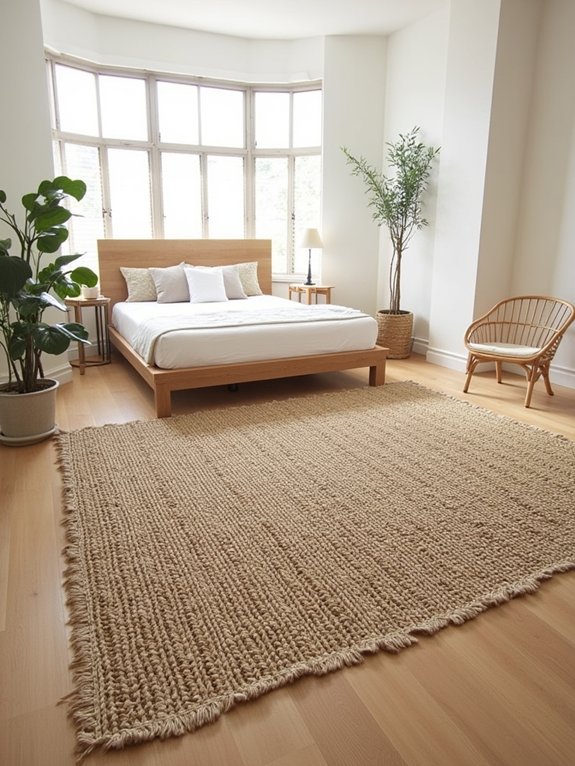 A hand-woven jute area rug adds natural warmth and organic texture to bedroom floors while offering practical durability for high-traffic areas. The textured weave patterns, ranging from herringbone to braided designs, complement wooden furniture and organic bedding to create a cohesive modern aesthetic.