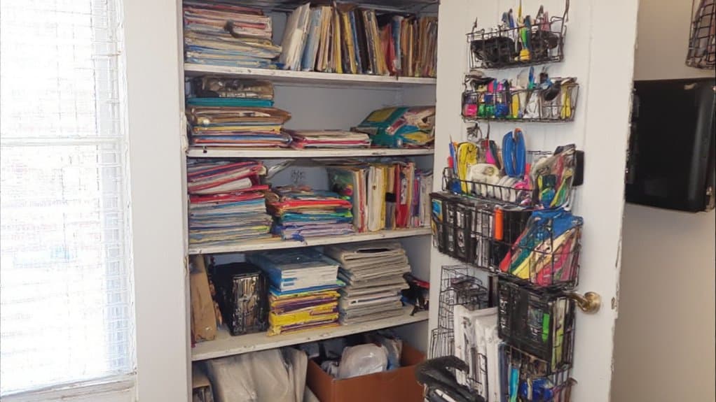 Next, assign specific storage solutions for each category to maintain order and accessibility in the office closet. Use labeled bins or drawers for smaller items like sticky notes and erasers, and designate shelves for larger supplies such as printer paper or notebooks. Ensuring each category has a designated spot not only aids in quick retrieval but also simplifies restocking and maintaining organization over time.