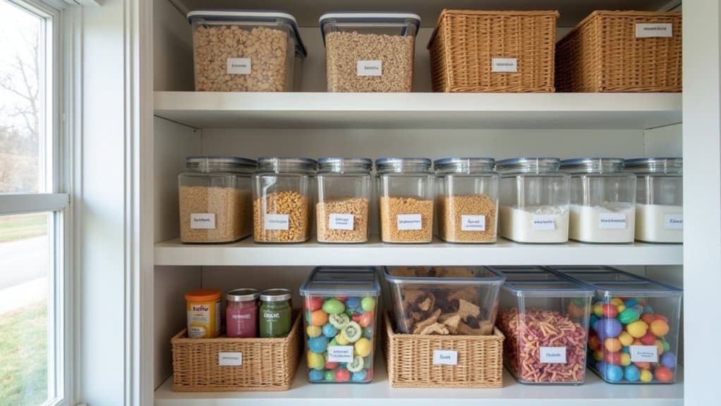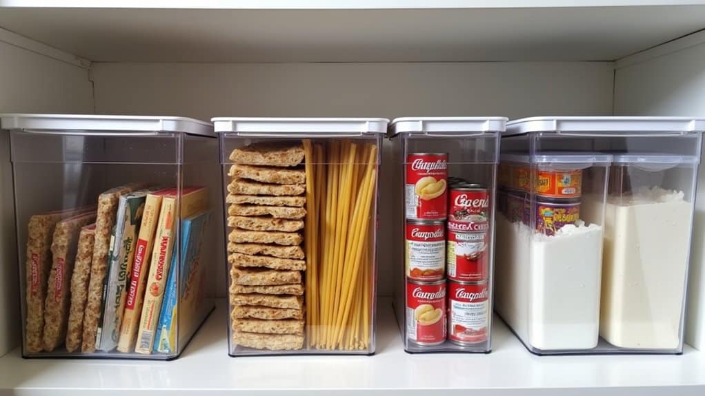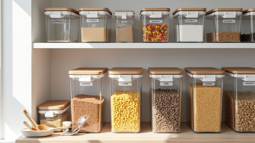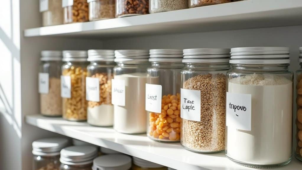 When choosing containers, also think about labeling to enhance accessibility and maintain order. Labels can be simple adhesive tags or reusable chalkboard stickers, allowing you to identify contents at a glance and avoid confusion. Consider the aesthetic of your pantry as well—matching containers or a cohesive color scheme can create a visually appealing setup that motivates you to keep it tidy. Ultimately, measure your shelf dimensions before purchasing to confirm the containers fit properly and make the most of your available space.