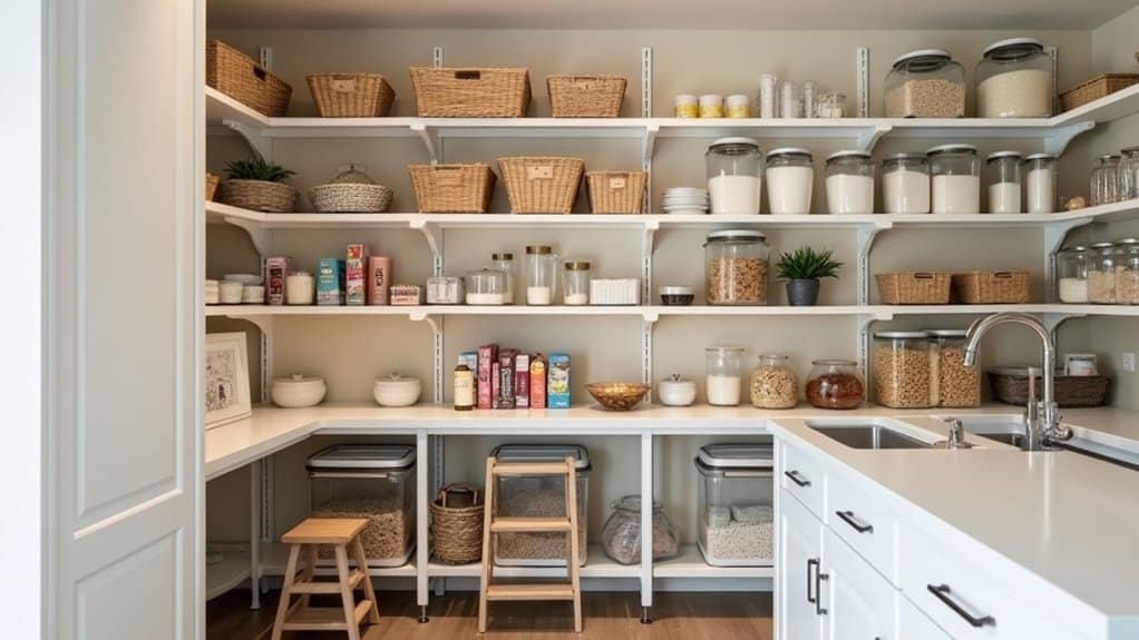 For taller shelves, consider adding hooks or hanging baskets beneath them to store lightweight items such as reusable bags or aprons. Adjustable shelving units can also be a great investment, allowing you to customize the height based on your needs. Label each section or bin to maintain order and guarantee everything has a designated spot. By utilizing vertical space effectively, you can greatly increase your pantry’s storage capacity and keep it looking neat and accessible.
