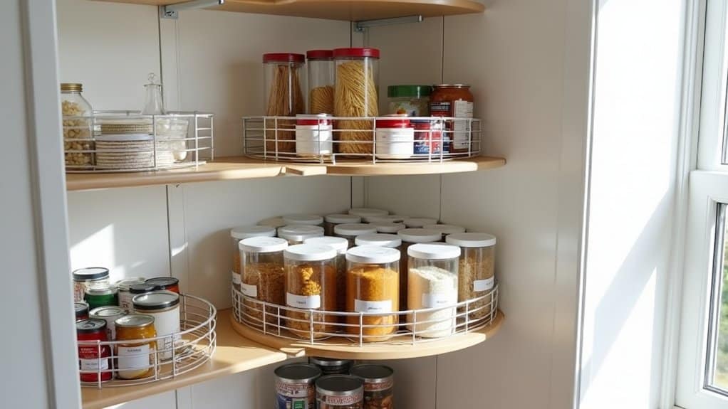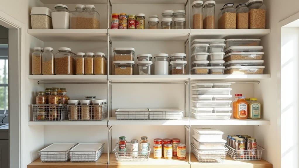 Adjustable shelving solutions are a game-changer for organizing pantry shelves, as they allow you to customize the space to fit your specific storage needs. Start by evaluating the items you store most frequently, such as canned goods, boxes, or bulk ingredients, and determine the ideal height for each category. Adjustable shelves can be moved up or down to accommodate taller items like cereal boxes or smaller stacks of spices, preventing wasted vertical space. Consider investing in sturdy, easy-to-install systems that can be reconfigured as your inventory changes over time. This flexibility guarantees that your pantry remains functional and clutter-free, even as your storage demands evolve.