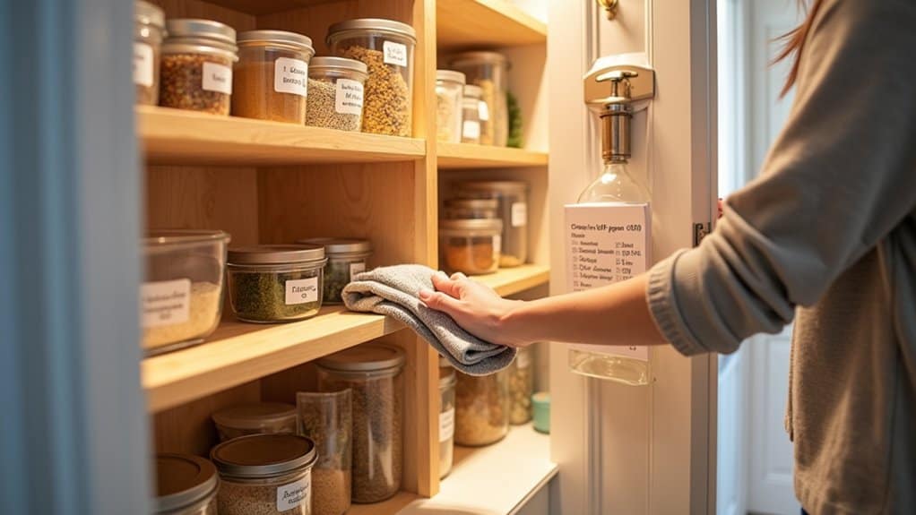Maintaining order in your pantry with regular upkeep is essential to prevent clutter from creeping back in after an initial organization. Set a consistent schedule, such as a quick check every two weeks, to assess the state of your shelves and address any misplaced items. During these checks, rotate older items to the front to guarantee they are used before expiration, and discard anything that is no longer usable. This routine helps keep your pantry functional and saves you from the frustration of searching through a disorganized space.