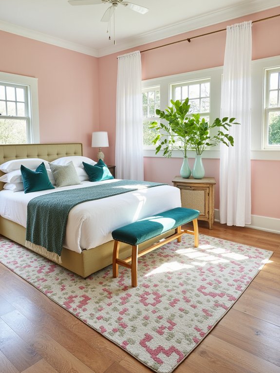Pink and green geometric area rugs create striking foundations for bedroom designs through their dynamic color interplay and bold patterns. Whether featuring modern abstract shapes or traditional medallions, these rugs combine versatile styles while adding visual depth through their distinctive color combination.