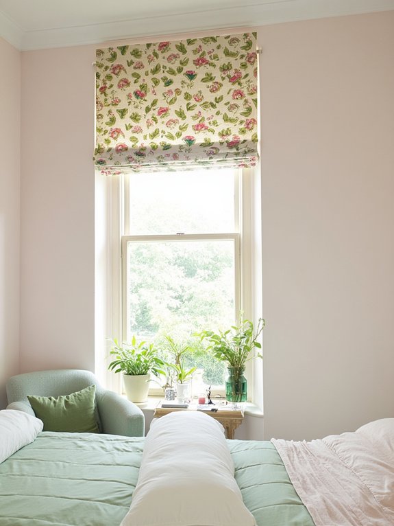 A pink and green floral window valance brings elegance to bedroom windows while creating a harmonious color scheme. The combination of soft pink blooms and green leaves produces a visually balanced look that softens the room’s angles and connects interior spaces with nature.