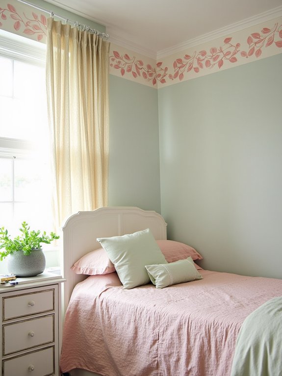 The borders come in peel-and-stick or traditional paste options, with widths ranging from 4 to 7 inches. They coordinate especially well with various green accent walls and can create visual flow when matched with floral textiles in the room. The botanical elements add subtle natural charm without dominating the space.