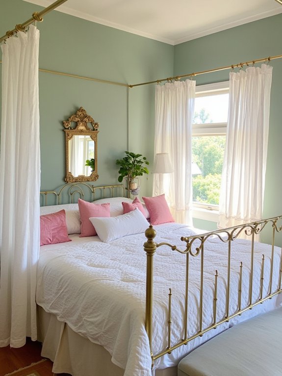 When complemented with matching sage green textiles and curtains, the canopy bed creates a cohesive, sophisticated look. Various textures in bedding and drapery add visual interest, while metallic accents on the bed frame enhance its luxurious appeal. This thoughtful combination results in a serene and stylish sleeping space.